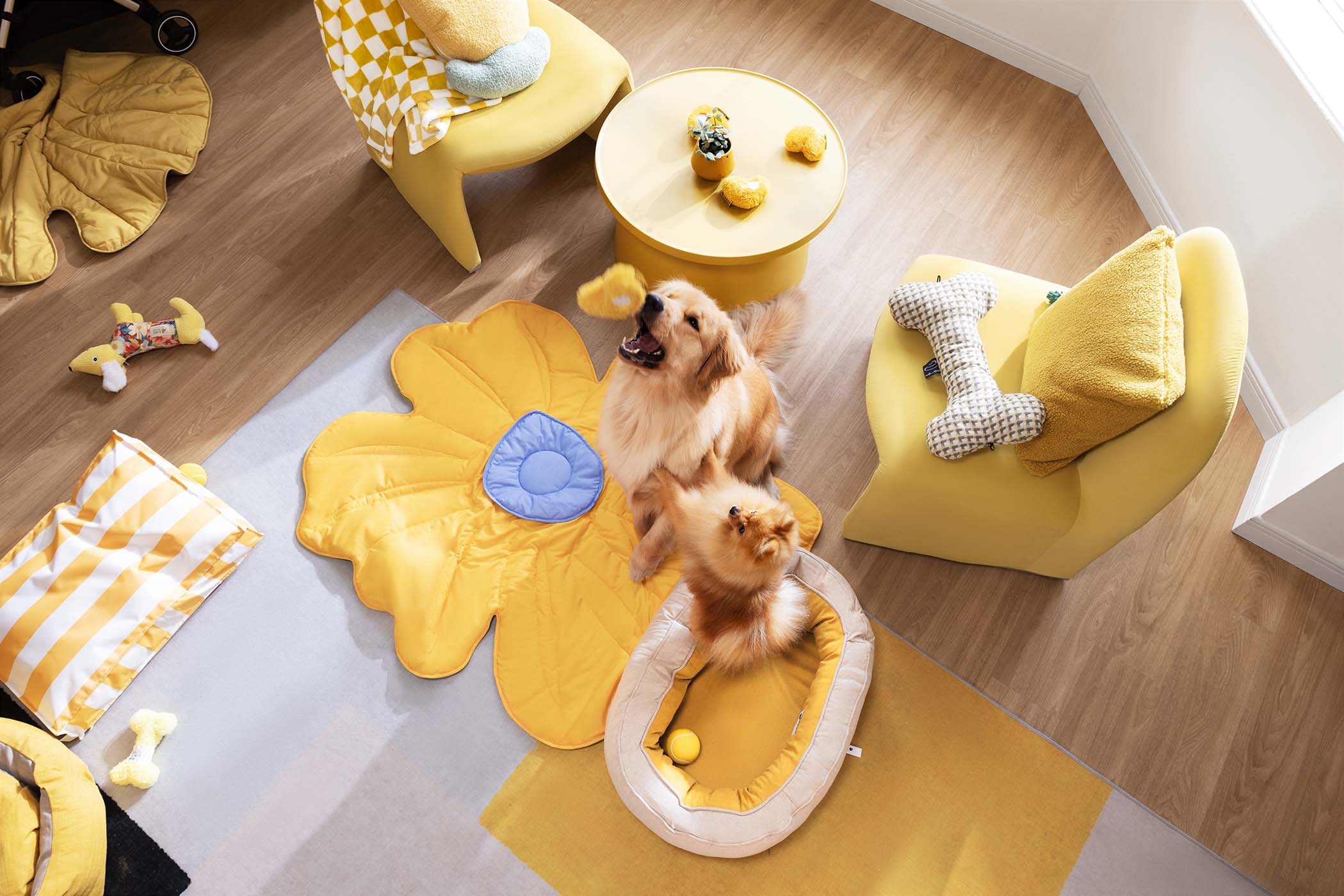 Tout a commencé lorsqu’un de nos designers, passionné par les animaux, a remarqué que son chien préférait systématiquement les jouets jaunes. Intrigué, il s’est penché sur le sujet et a découvert que les chiens perçoivent les couleurs différemment des humains : ils distinguent principalement le bleu et le jaune, tandis que les autres teintes leur apparaissent en nuances de gris.