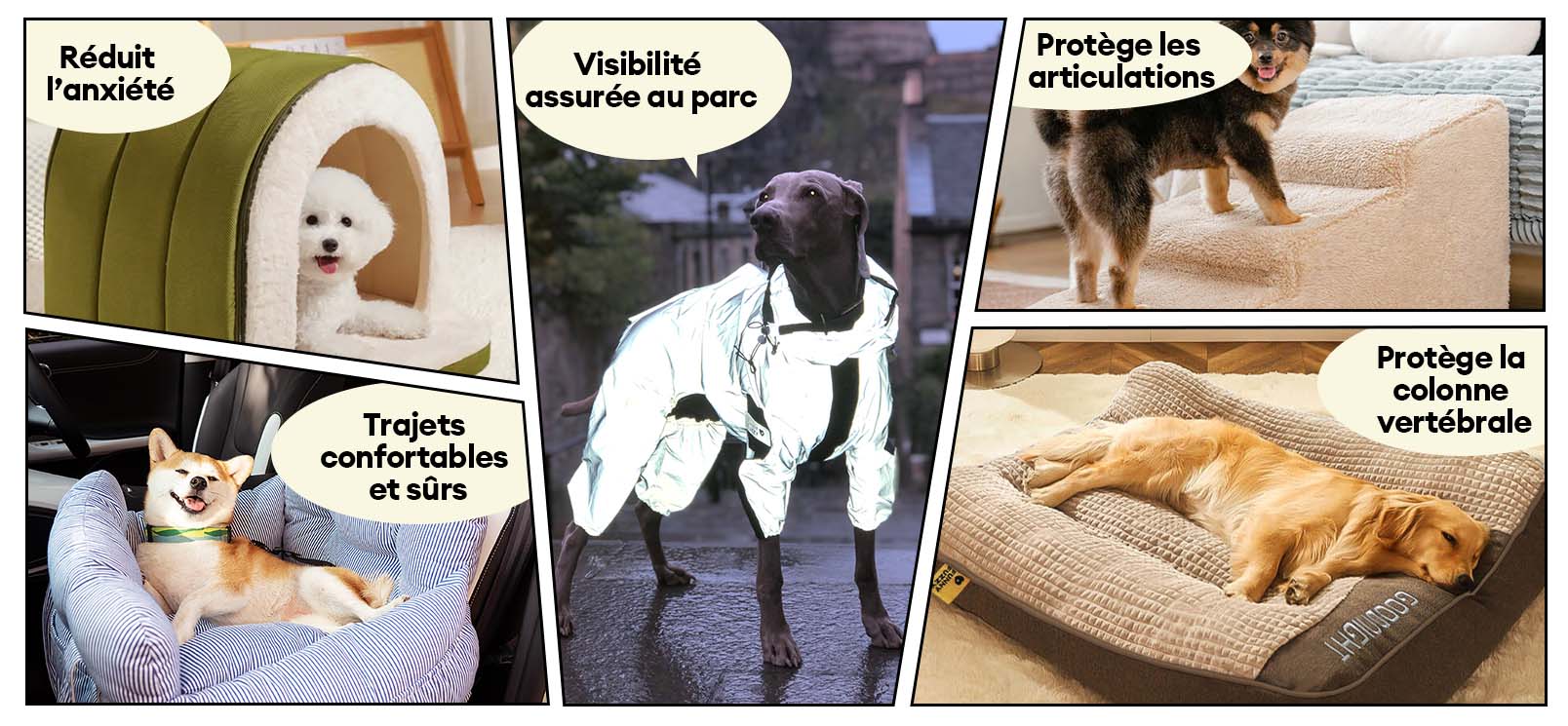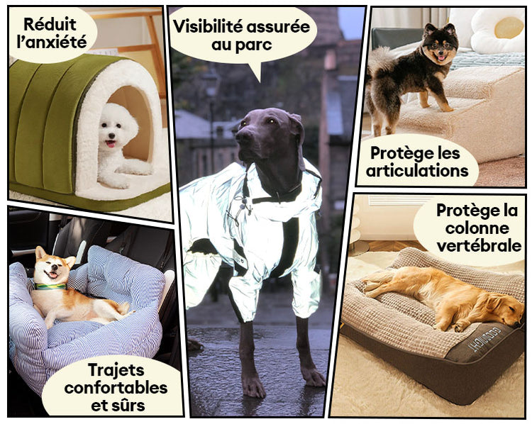 Des escaliers qui soutiennent les articulations pour des pas tout en douceur, aux lits orthopédiques et apaisants qui apportent confort et sérénité — chaque produit est pensé pour le bien-être de votre compagnon. Nos jouets à mâcher renforcent, nos coupe-griffes protègent, et nos manteaux le protègent du vent, du froid et de la nuit.