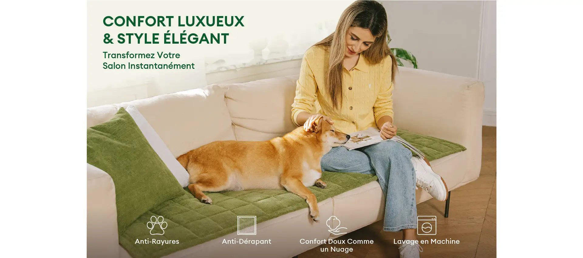 - Anti-Dérapant : Équipée d'un revers anti-dérapant à points, elle reste en place même avec des animaux énergiques ou des enfants qui sautent sur et hors du canapé.