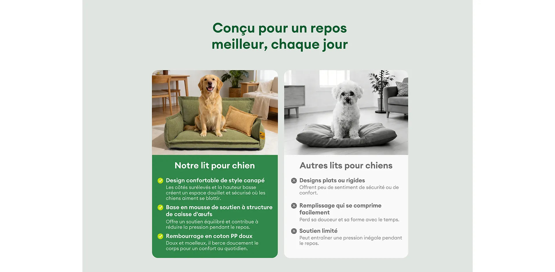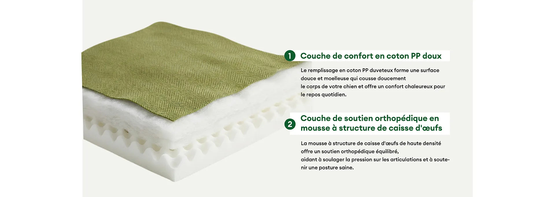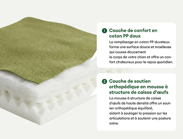 - Soutien orthopédique à double couche : Avec un rembourrage combinant mousse en forme d’œuf et coton PP dense, ce lit soulage articulations et muscles, offrant un soutien orthopédique optimal, idéal pour les animaux âgés, les petites races ou ceux en convalescence.